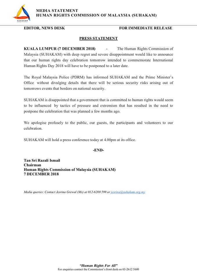 “SUHAKAM is disappointed that a government that is committed to human rights would seem to be influenced by tactics of pressure and extremism that has resulted in the need to postpone the celebration that was planned a few months ago.”