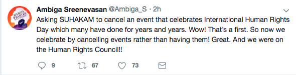 Ambiga Sreenevasan, chairman of the National Human Rights Society (HAKAM), took issue with the authorities’ vague warning, and their subsequent request for the event to be canceled, Tweeting to followers: