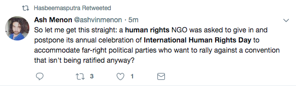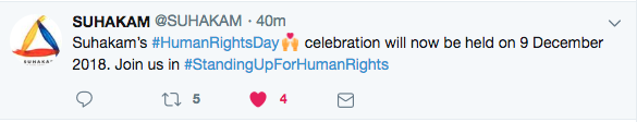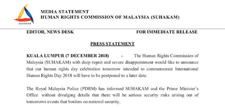 Many are protesting today’s announcement from the Human Rights Commission of Malaysia (SUHAKAM) that their pre-planned celebration of Human Rights Day this Saturday will now be postponed due to “serious security risks.”
