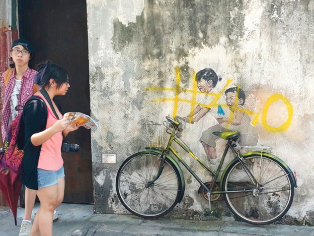 A world-famous mural by Lithuanian artist Ernest Zacharevic in George Town was vandalised some time last night, with the artwork defaced by yellow spray paint saying only “#4.0”.