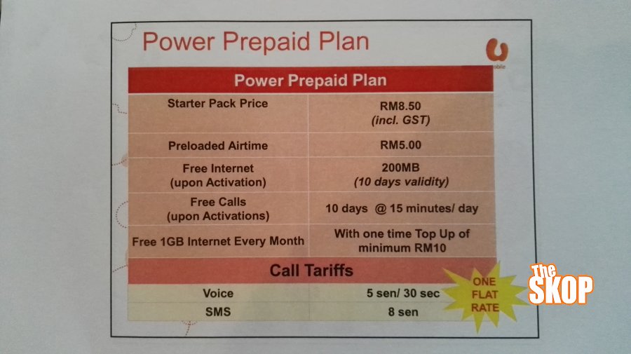 Pek permulaan prabayar U Mobile bernilai RM8.50 (termasuk GST) memberikan kredit RM5, dan internet berkelajuan tinggi 200MB serta 150 minit panggilan percuma selama 10 hari, selepas pek permulaan diaktifkan. Untuk pengguna prabayar U Mobile sedia ada, mereka boleh bertukar ke pelan Power ini, dengan caj pertukaran RM3.