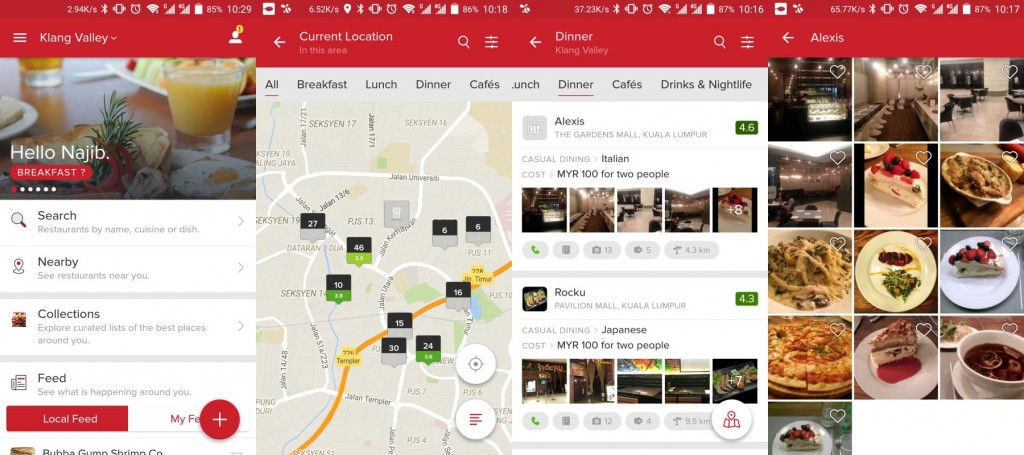 Terdapat pelbagai kategori pencarian boleh dibuat seperti sarapan, makan tengahari, makan malam atau tempat minum sahaja. Ia turut mempunyai kategori makanan seperti makanan laut, nasi lemak, atau daun pisang.