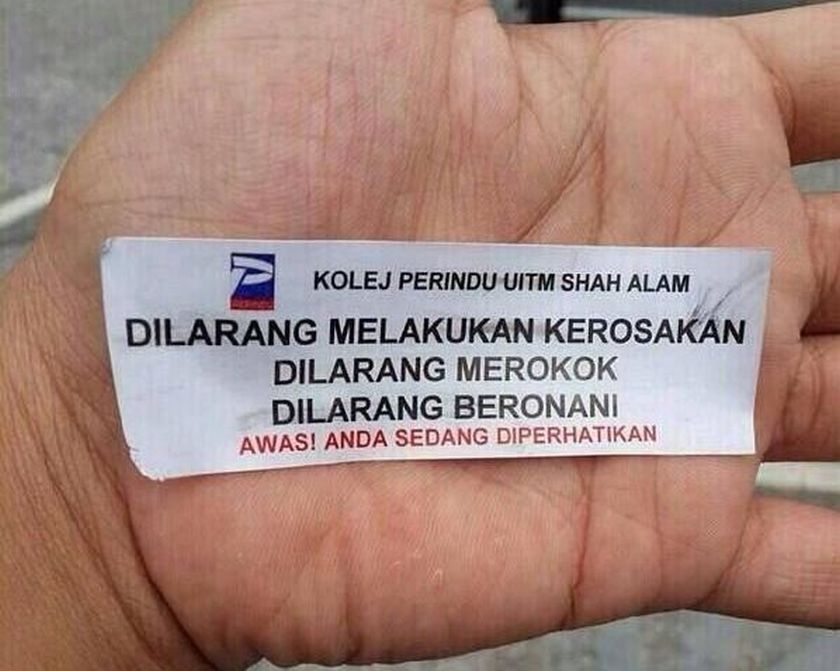 Images of the sticker, which says “Dilarang melakukan kerosakan, dilarang merokok, dilarang beronani. Awas! Anda sedang diperhatikan” (“Vandalism is proibited, smoking is prohibited, masturbation is prohibited. Beware! You are being watched”) has been circulating online.