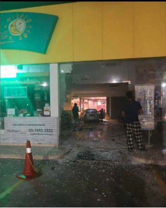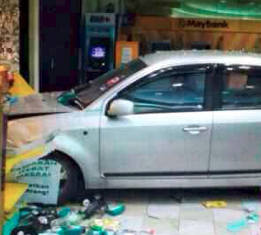 Returning to her vehicle, and starting the ignition, she claims that the gas pedal became stuck, and she careened through glass windows and shelves inside the shop before her car came to a halt inside at a Petronas station along Jalan Pesona.