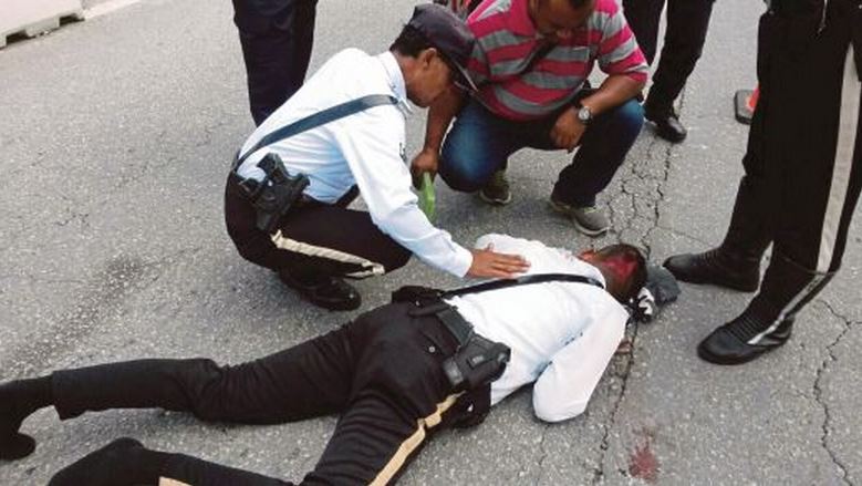 During the incident at around 11.45am yesterday, the traffic officer, 29-year old Mohd Hizzuad Johari, was injured on the back and head after being rammed by the motorcyclist.