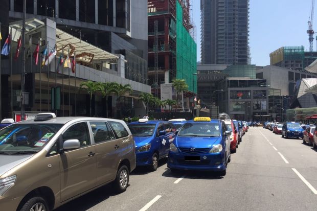 A group of taxi drivers had gathered and parked their vehicles near the Fahrenreit 88 shopping mall to protest against Uber and GrabCar.