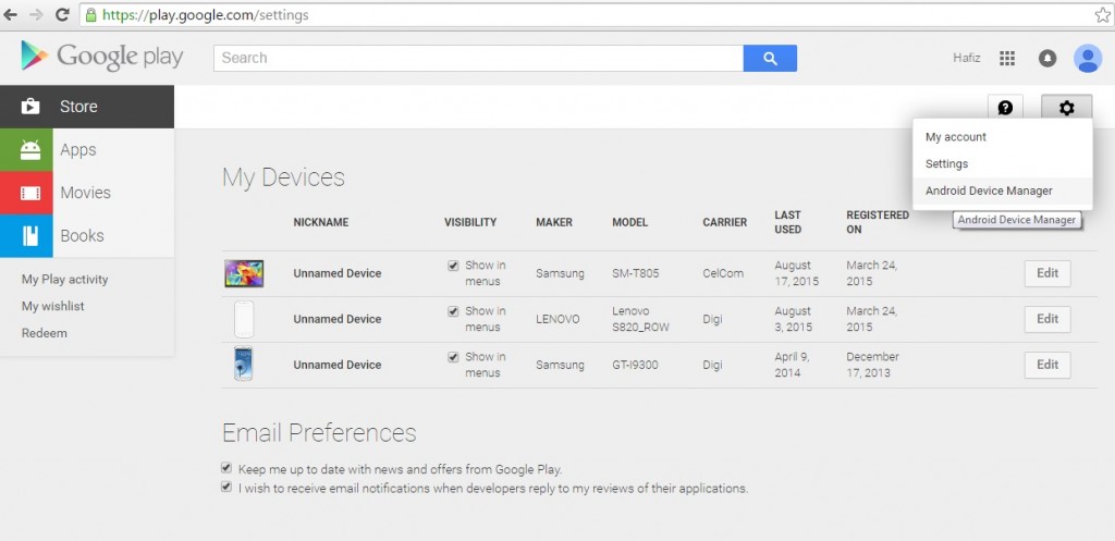 3. Cari ikon setting yang biasanya terletak pada bahagian kanan atas dan klik. Akan terpampang Android Device Manager.