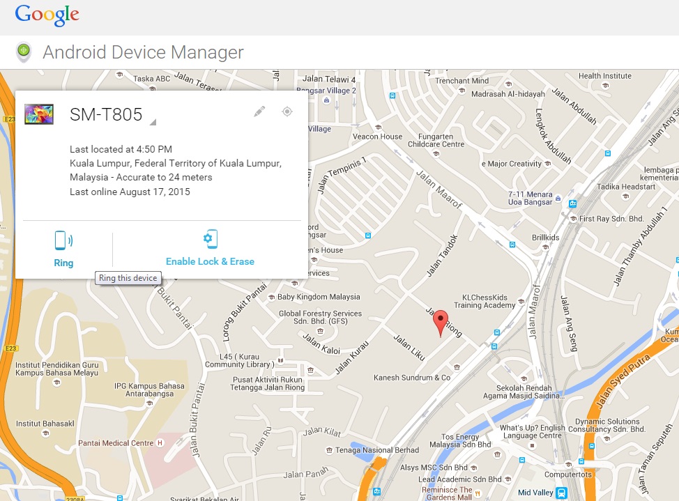 4. Klik pada Android Device Manager dan akan lihat daftar telefon anda serta ikon Ring.