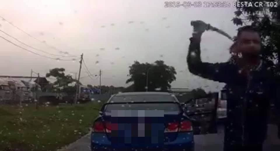 At first, they simply used obscene gestures to intimidate the other driver, returning to their car and driving a little further along the jammed road. Eventually they stop again, this time brandishing a parang (machete), and slamming it against the car windscreen.