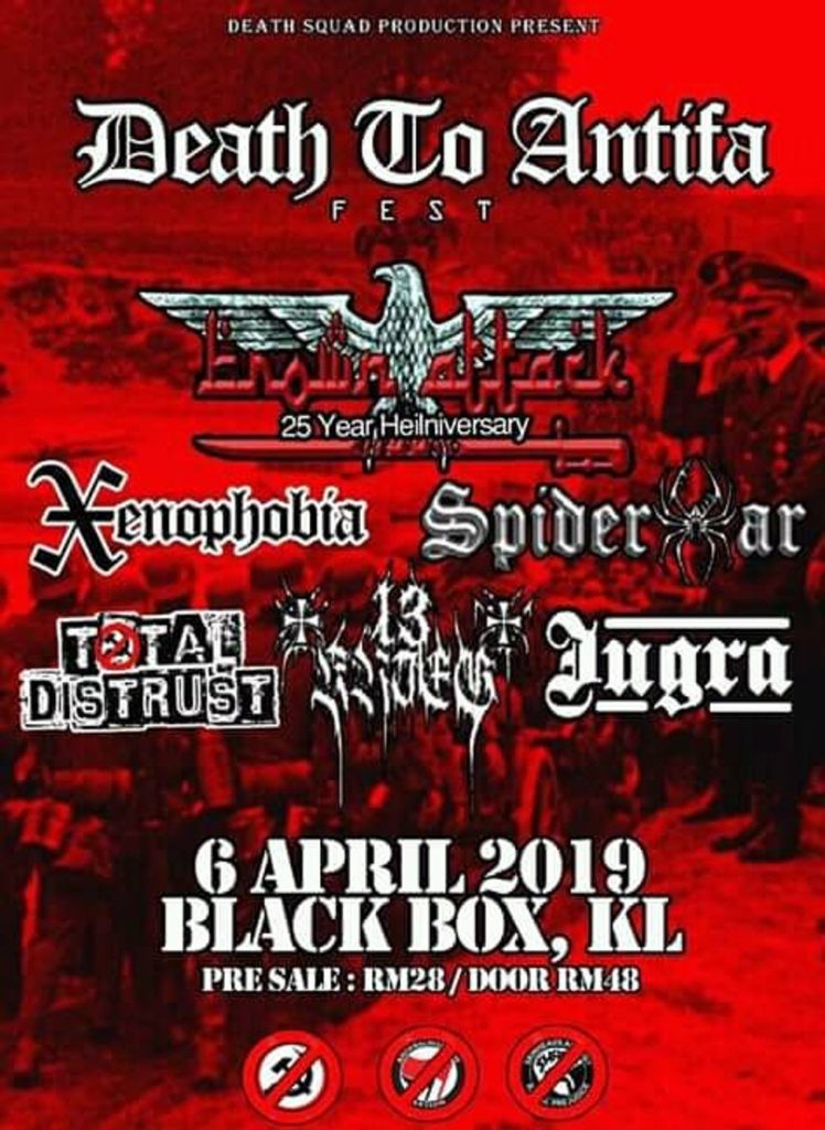 Rebellion Fest was due to be held in Ipoh, two and a half hours outside of Malaysia’s capital Kuala Lumpur, on April 13. It had advertised a bill that included high-profile Malay-power bands that included Xenophobia, Spiderwar, and Total Distrust, whose neo-Nazu fans were set to descend upon the city’s Ladyboss Studio venue, to celebrate their mutual feelings that all of those who were not ethnically Malay should leave the country. Oh, and an end to immigration.