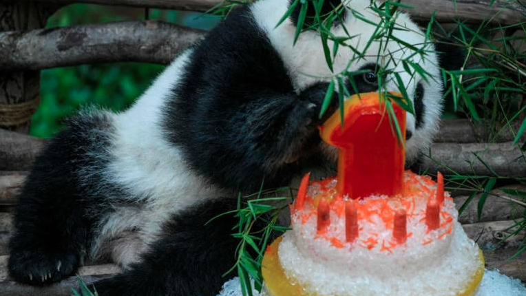 A giant panda born in a Malaysian zoo celebrated her first birthday Monday with a cake made of ice in front of adoring visitors.