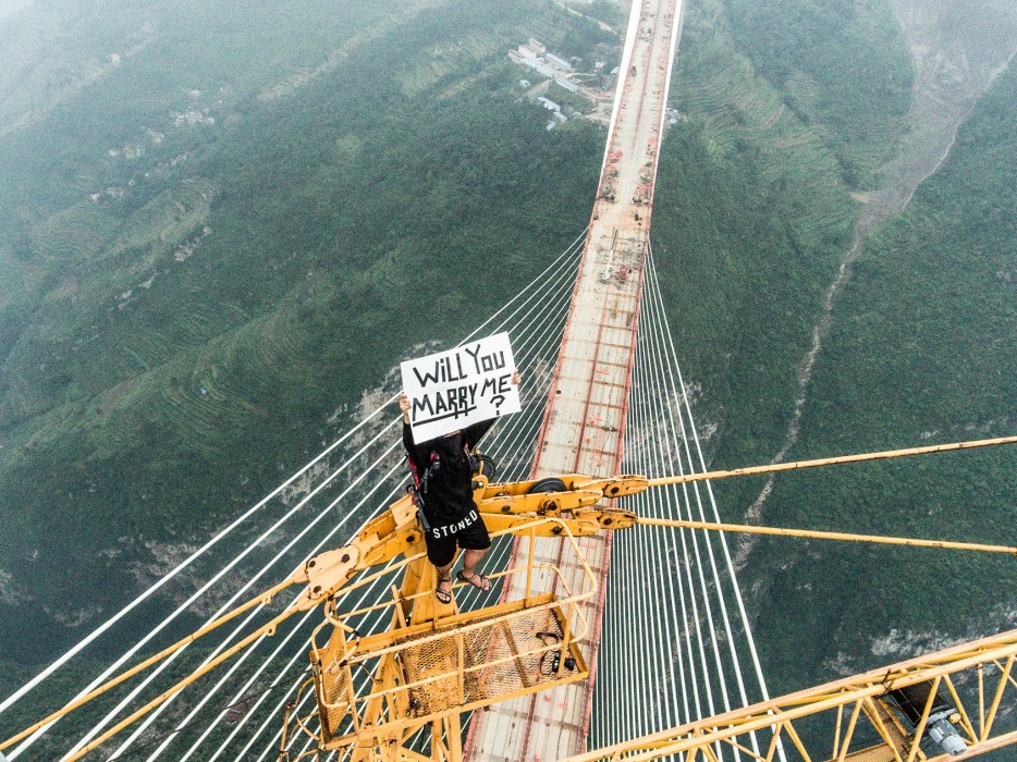 On November 26, the photographer uploaded a photo onto his Facebook page showing him standing on top of the Beipanjiang Bridge in southwestern China to hold up a “Will you marry me?” sign.