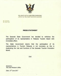 Just when everyone was wondering, ‘and then what?’ Sarawak promptly pulled out of the Malaysia Tourism Board and issued this letter: