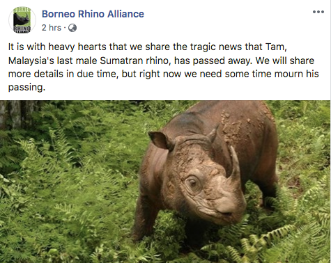Tam, aka Kertam, Malaysia’s last male Sumatran rhino, living in Sabah, passed away today after battling a series of health issues.