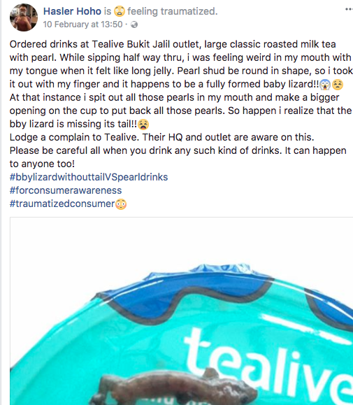 Hasler was understandably perturbed, and has since lodged a complaint with Tealive. His post has since been shared nearly 3,500 times.