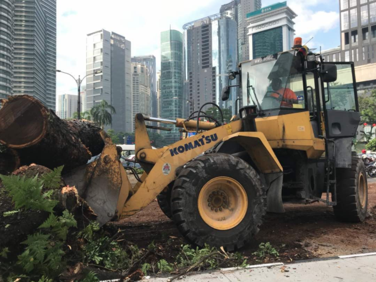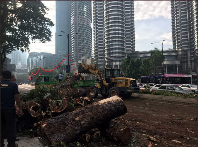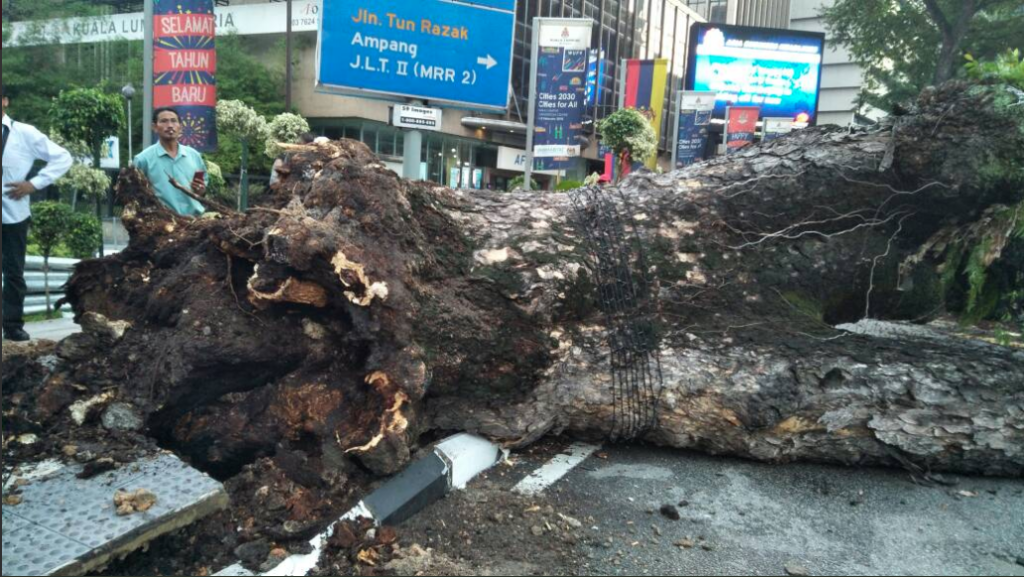 A massive tree collapsed today in KLCC, right in the shadow of the iconic Petronas Twin Towers, our city’s most widely recognized tourist attraction. The area is home to thousands of our city’s office workers, and the accident resulted in Monday morning commuter traffic along Jalan Ampang coming to a gridlock.