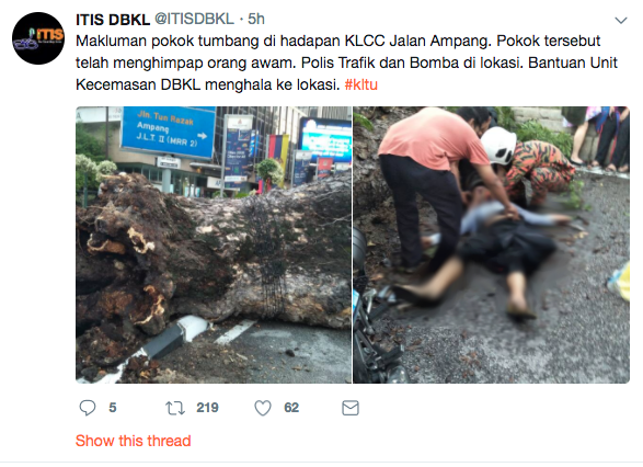 The less serious victim, a gentleman, was in his car when the tree fell, and sustained head injuries. He has been identified as Ong Chee Fook, 64, and gave a statement to Utusan Online saying that it occurred “out of nowhere” when he had stopped at the traffic lights.