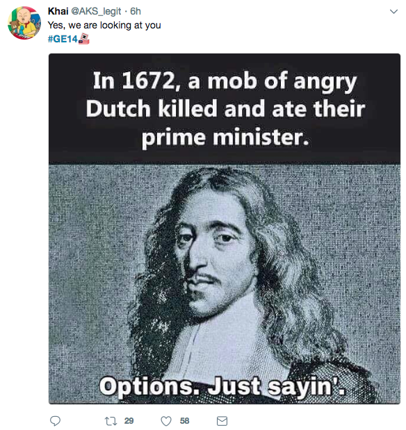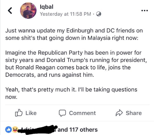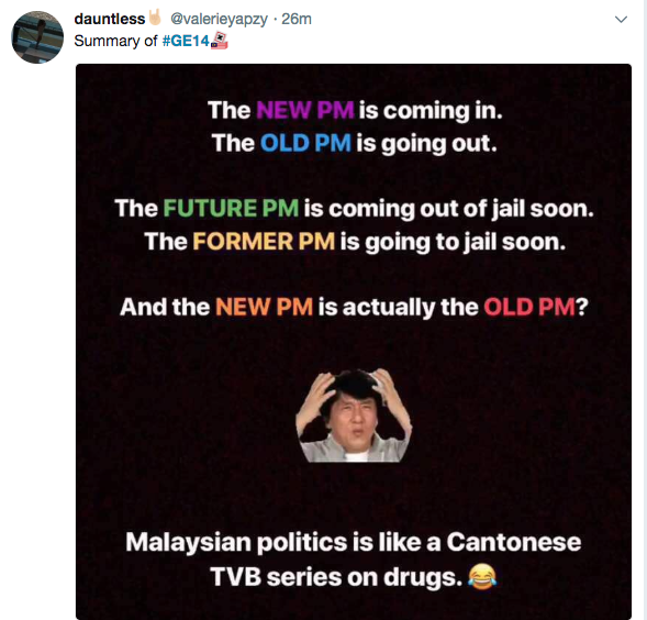 It was hard to explain to outsiders just how twilight zone-esque the whole situation was for us watching Mahathir run against his former protege Najib. This pretty much summed it up: