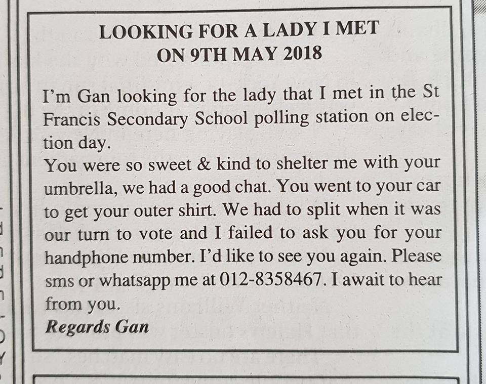 Gan, a civically-minded Sabahan has taken an ad out in his local classifieds hoping to be reunited with a particularly enchanting woman that he met on Malaysia’s 14th General Election at their local polling station in Kota Kinabalu.