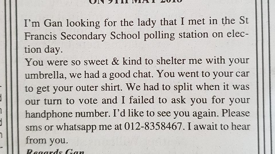 Gan, a civically-minded Sabahan has taken an ad out in his local classifieds hoping to be reunited with a particularly enchanting woman that he met on Malaysia’s 14th General Election at their local polling station in Kota Kinabalu.