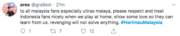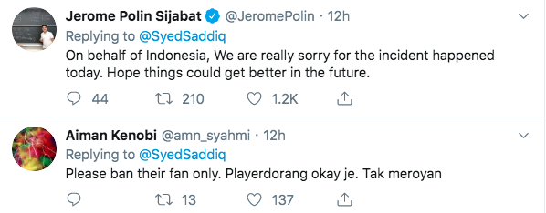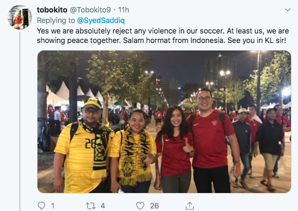 Several Indonesian fans have responded to the Syed’s Twitter statements, apologizing for the behavior of the reprehensible few, saying that it was some fans only, with one user even posting a side-by-side photo of Malaysia and Indonesia fans together and smiling.
