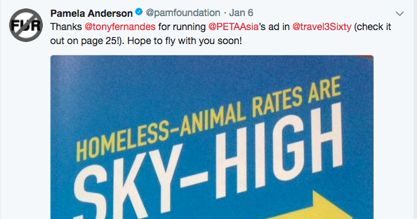 Two days ago, she tweeted at Air Asia CEO Tony Fernandes, and … thanked him for his ethical treatment of animals.