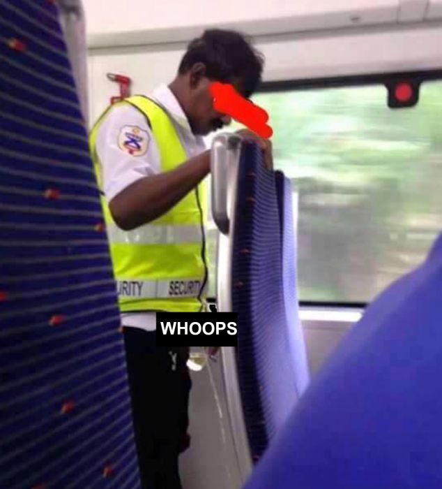 A photo seemingly showing a man in a security guard’s uniform urinating inside the coach of a train has gone viral online. The photo, which was posted by a Facebook page called Otai BERSIH, has been shared close to 500 times: