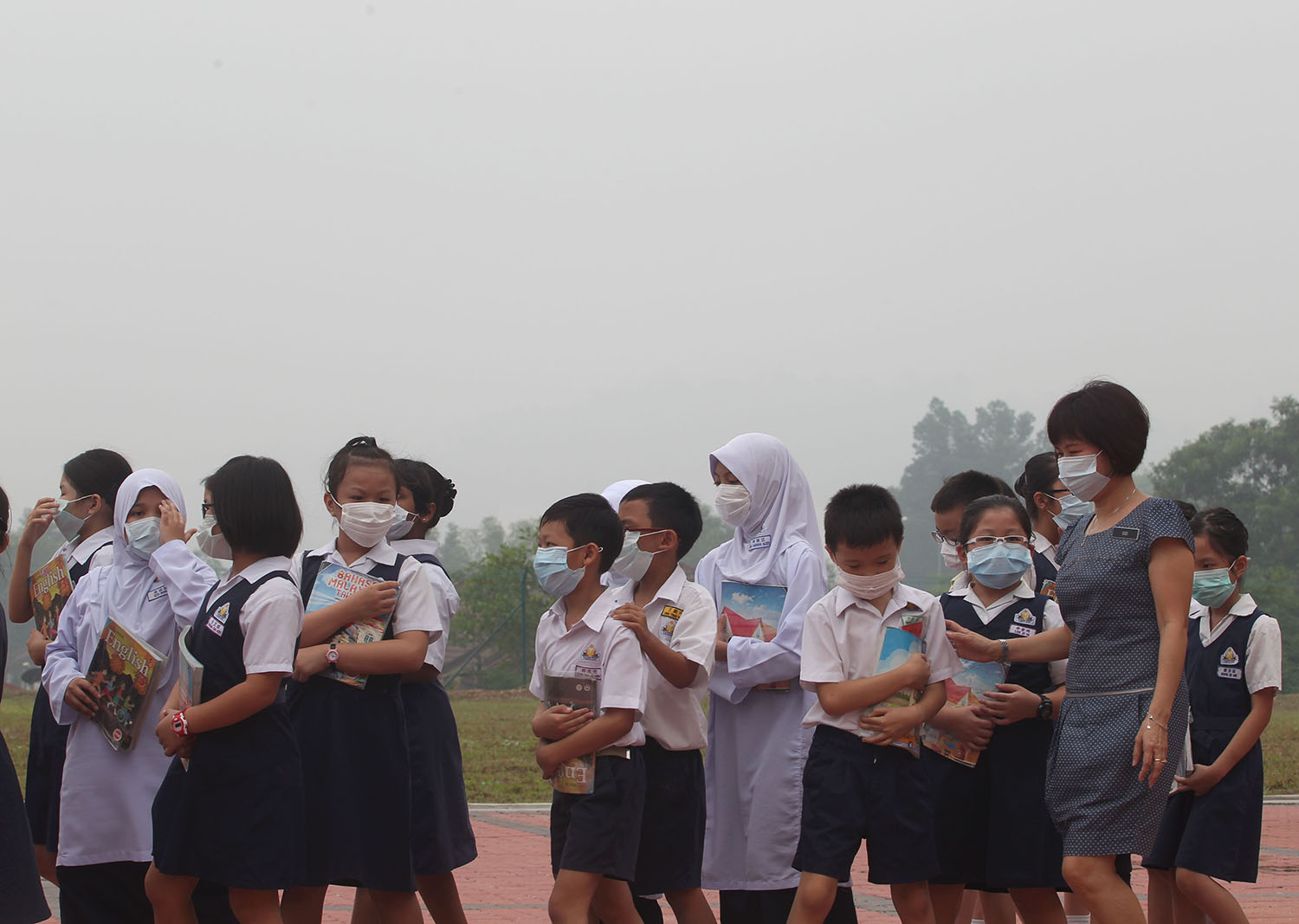Pupils of SJK (C) Bukit Serdang put on masks due to heavy haze on Sept 14, 2015