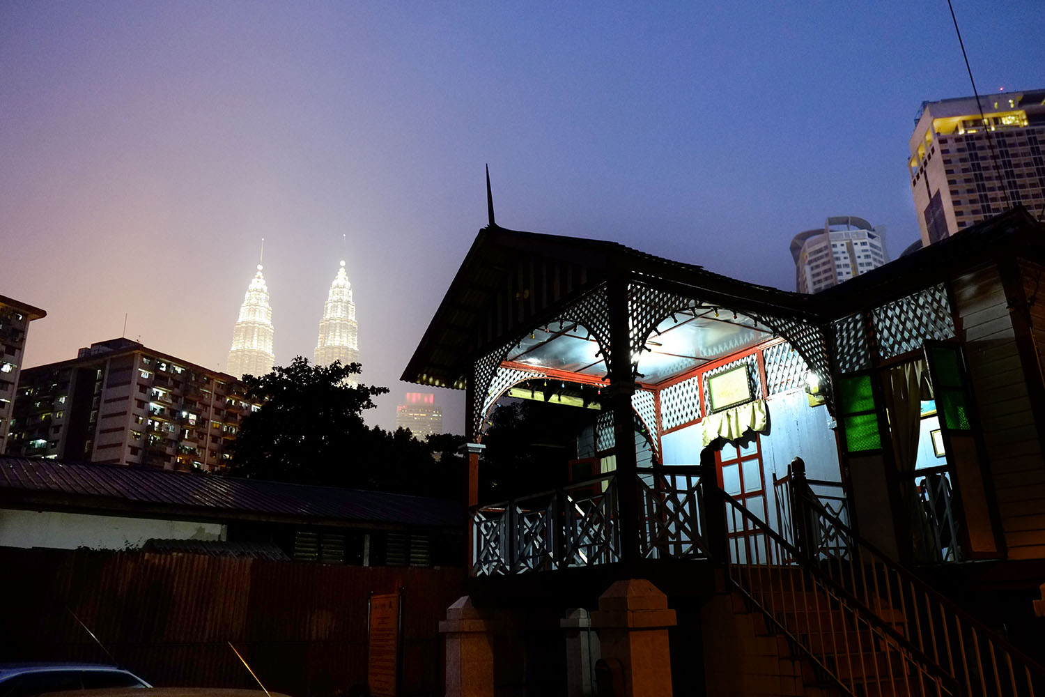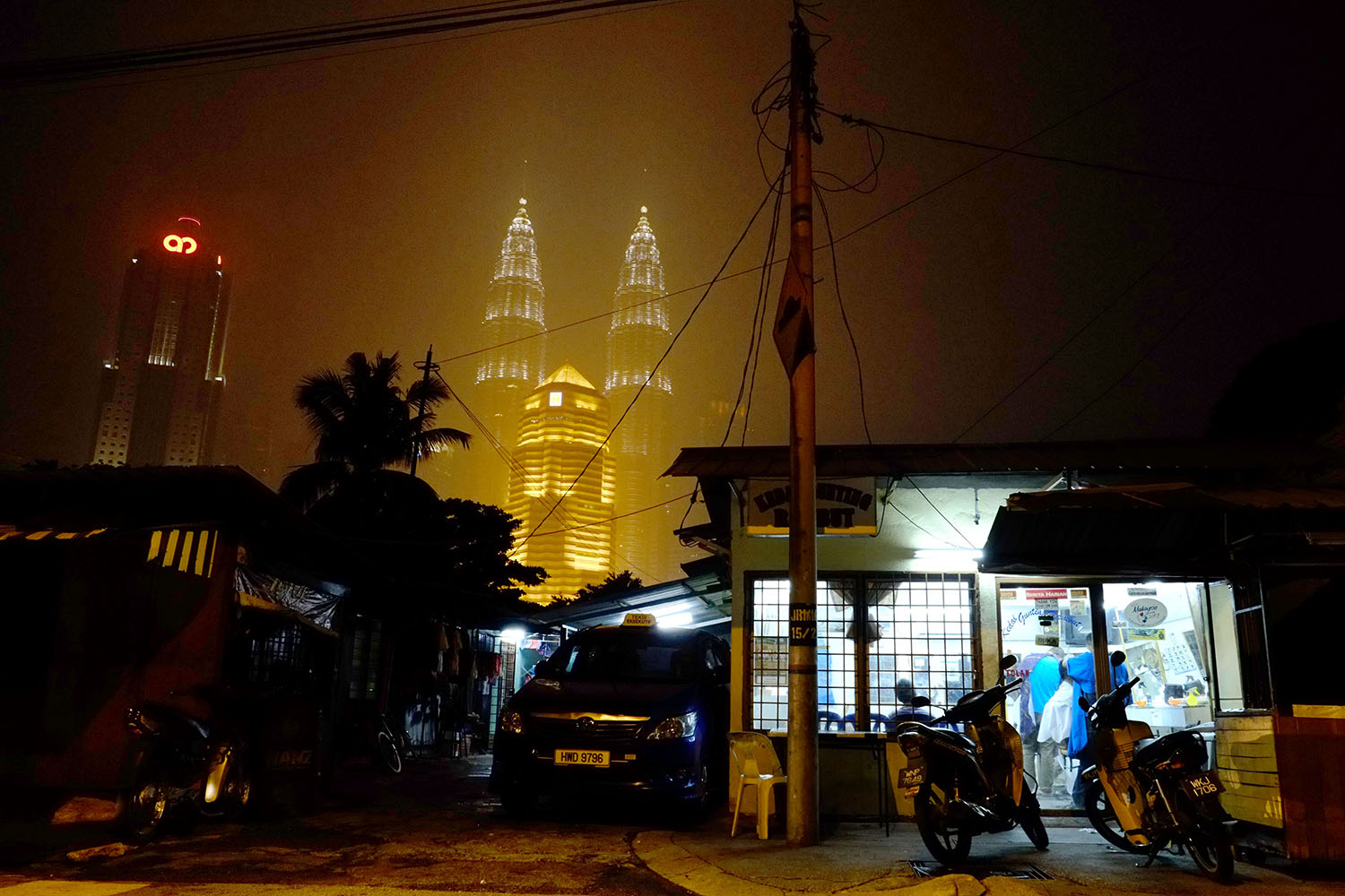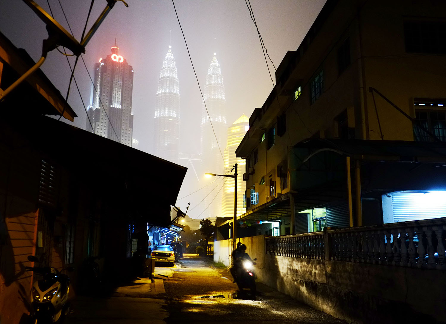 An alley in Kampung Baru with haze-engulfed KLCC in the background
