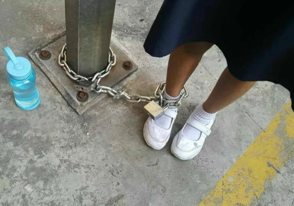 The photos, which reportedly began circulating on Facebook since Wednesday evening, show the primary schoolgirl’s right leg being chained and padlocked to a pole while her schoolbag and her water bottle are left on the ground beside her.