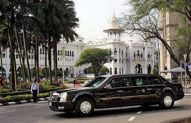 The custom-built Cadillac — with night vision cameras, puncture-proof tires, oxygen tanks and armour plated fuel tanks — has been brought to Malaysia twice on both Obama’s visits to Malaysia.