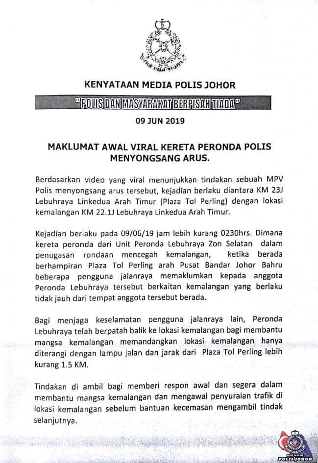 After a viral clip of a police vehicle speeding against highway traffic went viral over the weekend, Johor state police have released a statement that the car was rushing TO an accident, and was not, as some netizens had suggested, the cause of it.