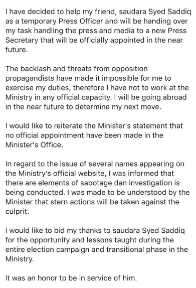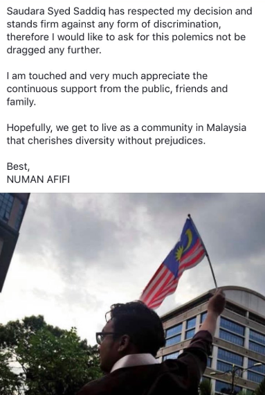 Thanking Saddiq for the opportunity to serve and learn, he asked for the polemics of his resignation to not be dragged any further, and told his supporters that the youth minister also stands firm with him against any form of discrimination.