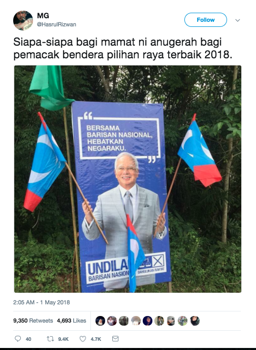 Social media user @HasrulRizwan used a photo of a Barisan Nasional campaign poster for the upcoming election that had been decorated with opposition party flags, and commented that someone should get a prize for “best flag placing.”