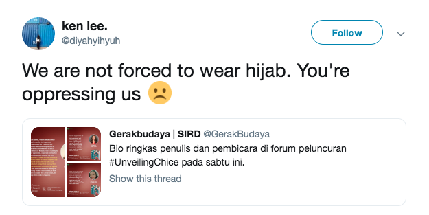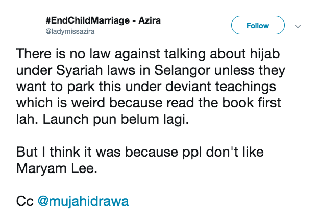 The book in question was written by activist Maryam Lee, and chronicles her experience, as well as that of two other women, in deciding to remove the hijab.
