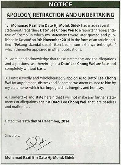 In it, Razif admitted that his statements — alleging that Lee was a long-time user and that the Badminton Association Malaysia (BAM) had known about it all along — were false and baseless.