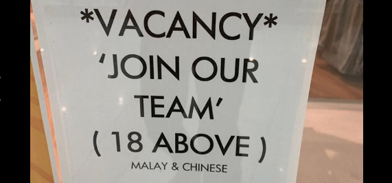 Over the weekend, Shambavi Shankar was doing a little shopping at the AEON in Bukit Tinggi, just outside Kuala Lumpur, was shocked to suddenly find herself staring at a discriminatory job ad posted in the window of a clothing store.