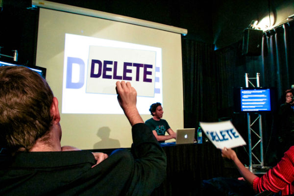 How to up that ante? Easy: Lobel asked for volunteers to delete one of their friends from Facebook. I remarked later that, maybe as part of the Asian mentality, we are more prone to delete ourselves from online social networks rather than delete some of our contacts – the aversion for confrontation and awkwardness, coupled with an inherent inferiority complex and self-imposed humility, dictates that we fall on our swords rather than strike others out. A hand eventually juts out – a volunteer was willing to delete forever a friend from her list, in front of all of us. She logs on, and starts skimming her friends list. She finds a name, and describes their relationship. A casual acquaintance at best, who has not been in touch for almost as long as they’ve had each other on Facebook. “DELETE” cards flew up; we egged her on. She hit the “Unfriend” button; everyone clapped. Another volunteer: this time to re-add someone they’ve deleted. An ex, broken up under less than friendly circumstances. She’s blocked him permanently, and so his attempt to publicly re-add her failed. We all felt the hurt at the preemptive rejection.