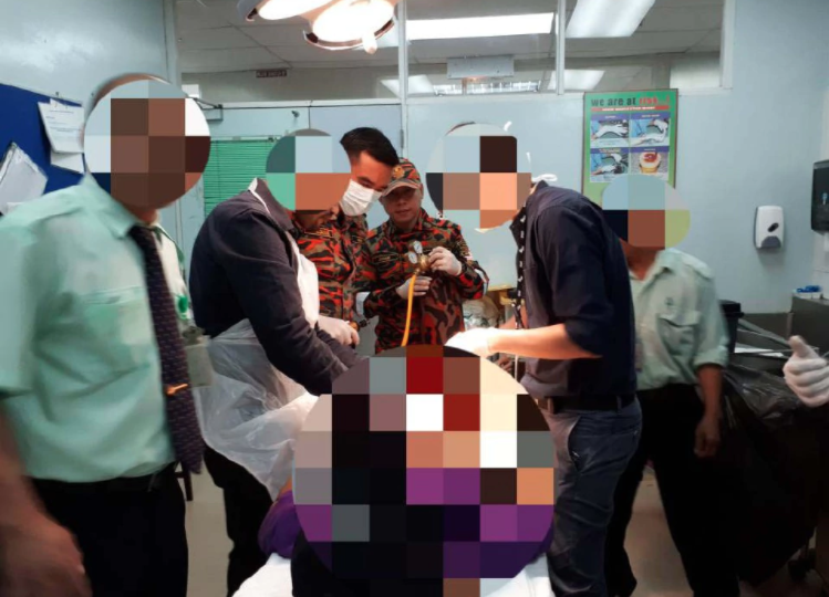 Officials arrived at the man’s house at 11:30am, considering the precarious nature of metal objects hanging from his dong, decided it was best to take the victim to Sarawak General Hospital, to avoid further injury.
