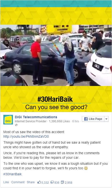 Telco DiGi Telecommunications, as part of its #30HariBaik social media campaign, jumped on the case of the Kuantan road rage video currently exploding on the Malaysian interwebs, and offered to pay for the repairs to the elderly Chinese man’s car – which, apart from grazing the brand-new Peugeot in the video, was also given a few cracks from the woman’s steering lock.