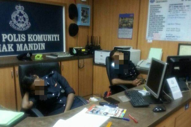 The two were caught in the snooze recently, photographed sleeping on the job at the reception counter of the Mak Mandin police beat in Penang. The photo made the usual buzz around social media yesterday and has now taken a more serious tone: both of them have been given transfer orders.