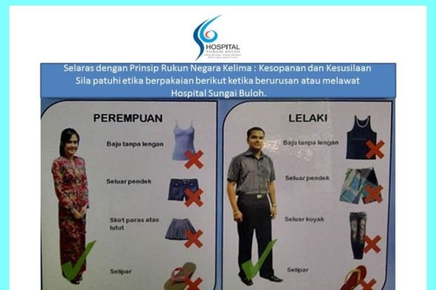 This time around, it’s the Sungai Buloh Hospital, whose security personnel stopped a woman wearing shorts from entering the main building, telling her to wrap a towel around her waist before she could proceed.