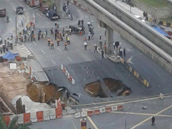 Tunnelling work being conducted under busy Jalan Imbi close to Berjaya Times Square caused a section of the road to collapse at 10.40am this morning, leaving a sinkhole just metres away from KL Monorail support pillars.
