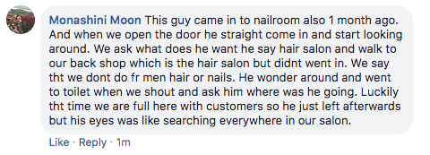 User Kyetherine Sim explained that she had noticed the man making consistent visits to her salon, asking for facials, despite the fact that he had already been told that they only serviced a female clientele. After several unsuccessful attempts, she checked her shop’s CCTV cameras to find that on more than one occasion, the man was captured loitering in the staircase, trying to peep inside.