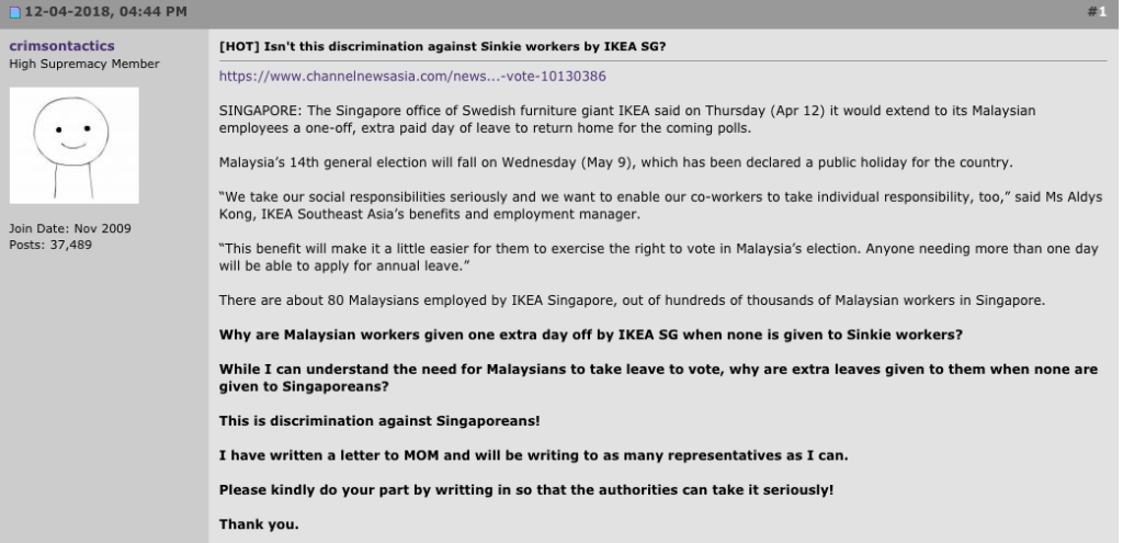 One poster to local message board hardwarezone.com.sg asked WHY, WHY are extra leaves given to them when none are given to Singaporeans. They have taken the initiative, and written directly to their local MP, as well as the Ministry of Manpower, so that they can investigate the ghastly affront on Singaporean rights. The thread is over 50 pages long at present.