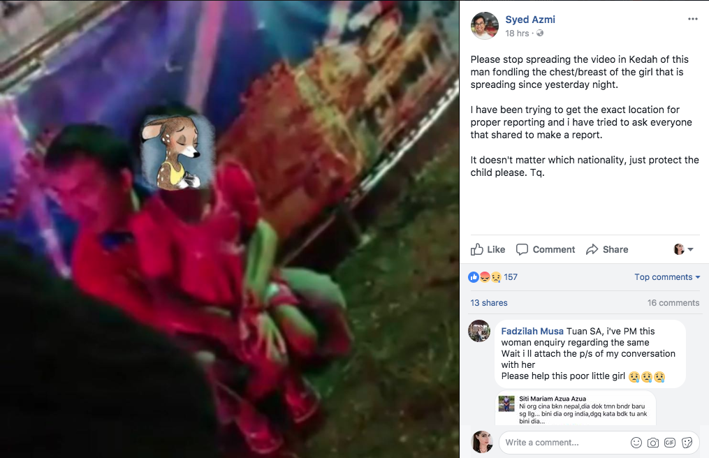 Activist Syed Azmi Alhabshi took to his personal Facebook page, along with a screencap of the video along with the child’s face blurred out, asking user to “please stop spreading the video in Kedah of this man and girl that has been spreading since yesterday night.”