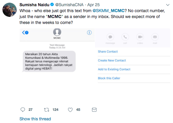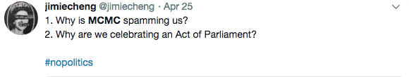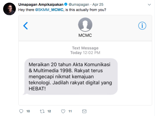 Eric Paulsen, co-founder of the activist group Lawyers for Liberty, was also a recipient of the message. He wrote that if indeed the message were to have come from the MCMC itself, he sees a case to be made for an offense under the very Communications & Multimedia Act the commission was founded on. Ooh, meta!