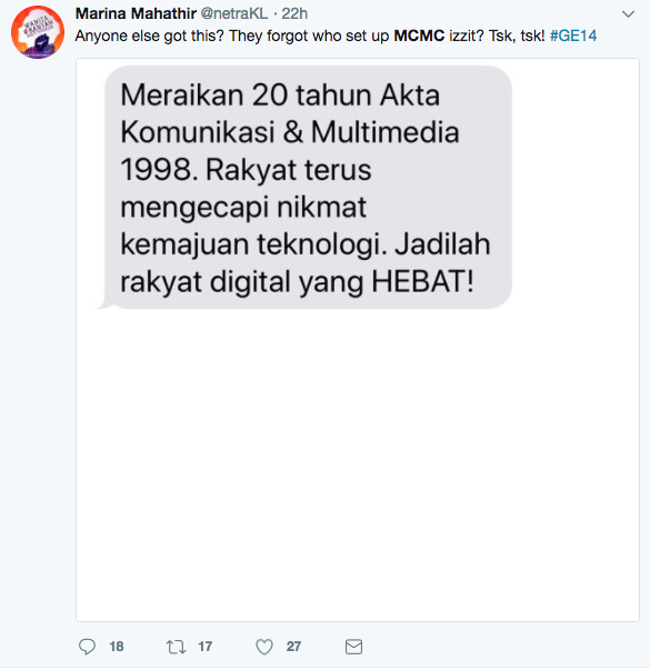 She wrote to her followers, asking: “Anyone else got this? They forgot who set up MCMC izzit? Tsk, tsk! #GE14” Marina is alluding to the fact that the act was put into place by her father during his tenure as Prime Minister.