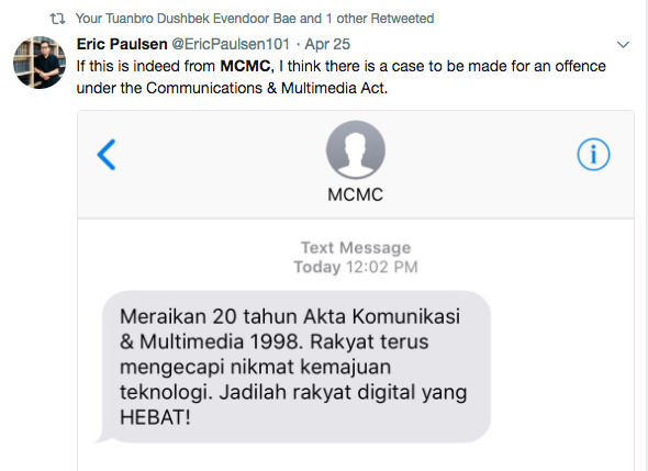 Eric Paulsen, co-founder of the activist group Lawyers for Liberty, was also a recipient of the message. He wrote that if indeed the message were to have come from the MCMC itself, he sees a case to be made for an offense under the very Communications & Multimedia Act the commission was founded on. Ooh, meta!
