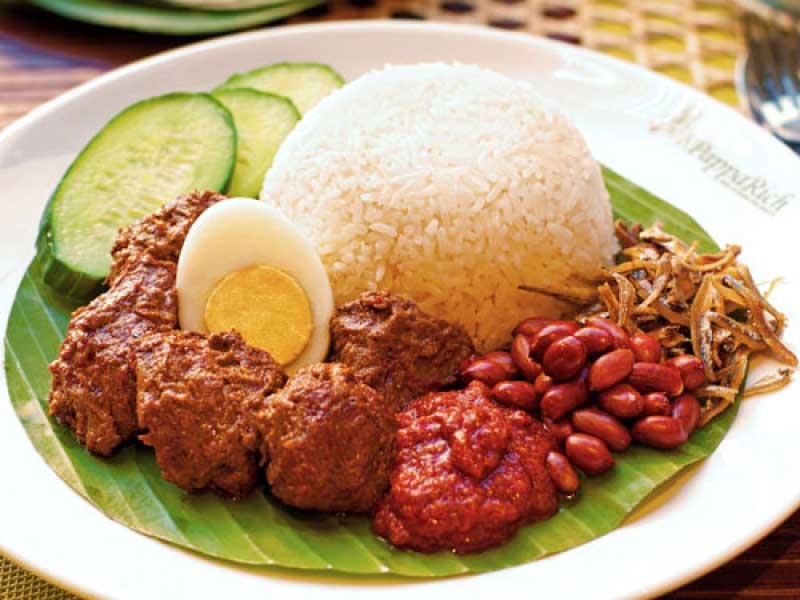 Soaked and cooked in coconut milk, rice is garnished with anchovies, cucumbers, roasted peanuts, hard boiled egg and spicy sambal sauce.